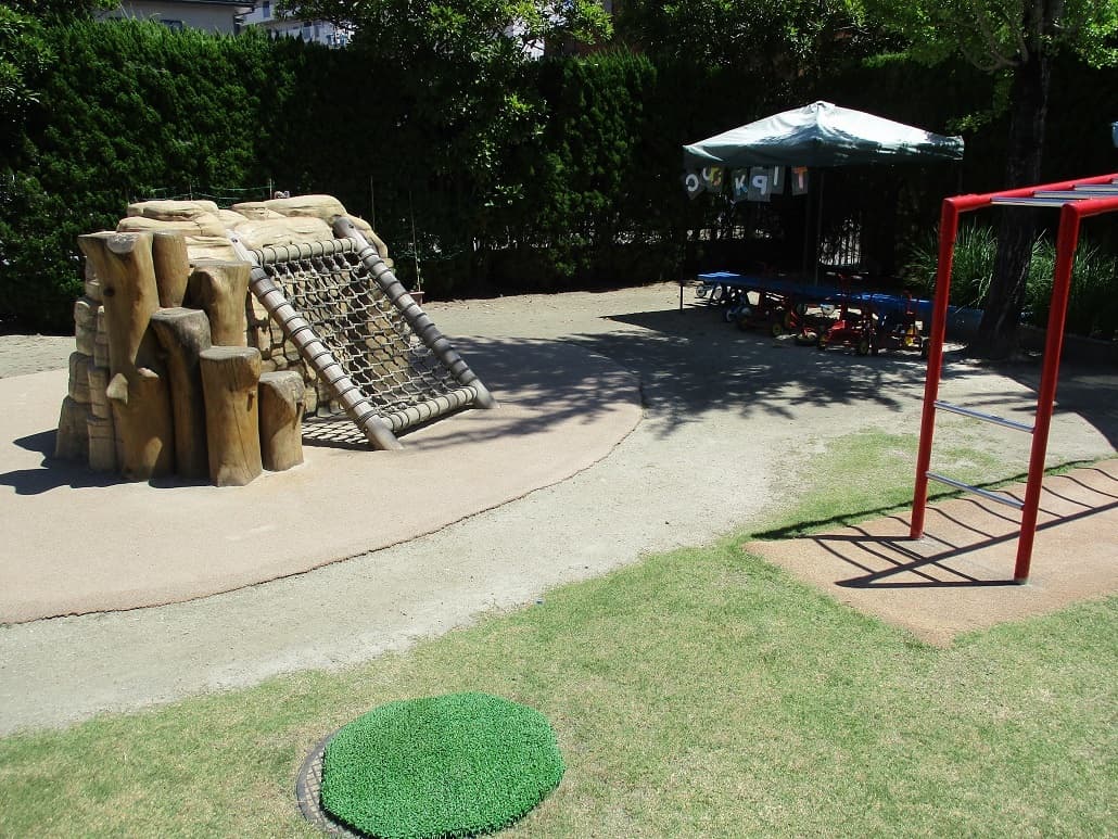 園庭の環境を考える時、自然には叶いませんが、出来る範囲で様々な素材の地面ということを考えています。砂、芝、クッション性のある地面、コンクリート、レンガのインターロッキング、アスファルト、木の根の出ている所、高低差のある所、石畳など、感覚を通して学んでいくこと、認知的な知識ではなく非認知的な感覚、体感を通して遊びながら体験しながら学んでいくことも大切にしています。