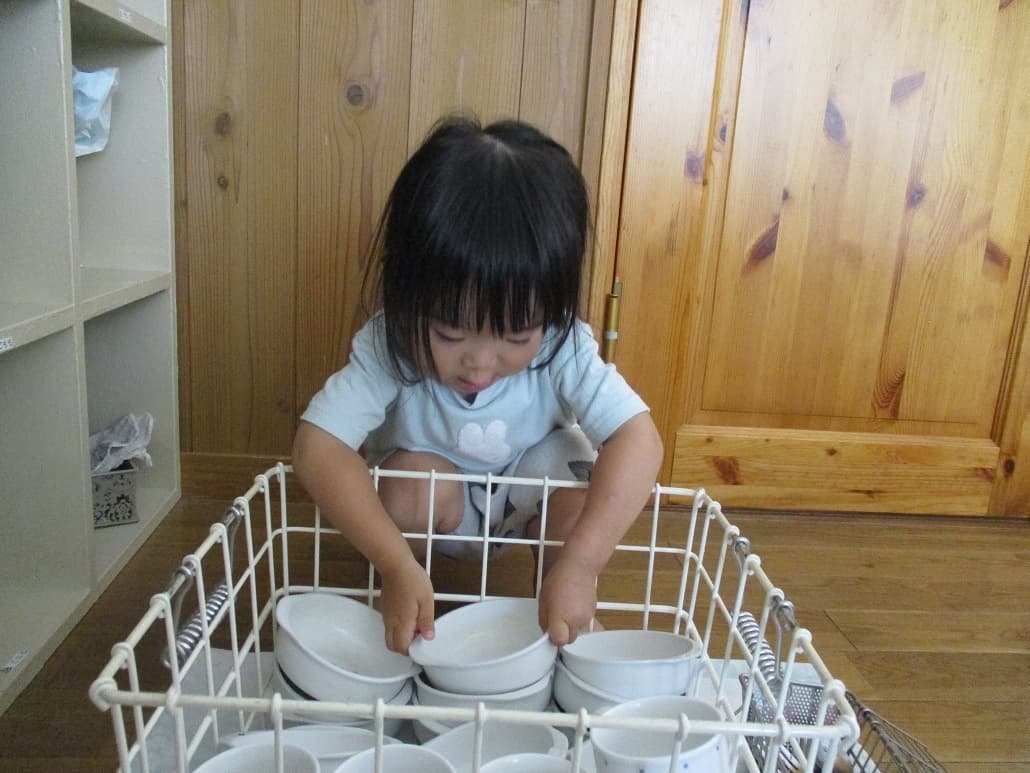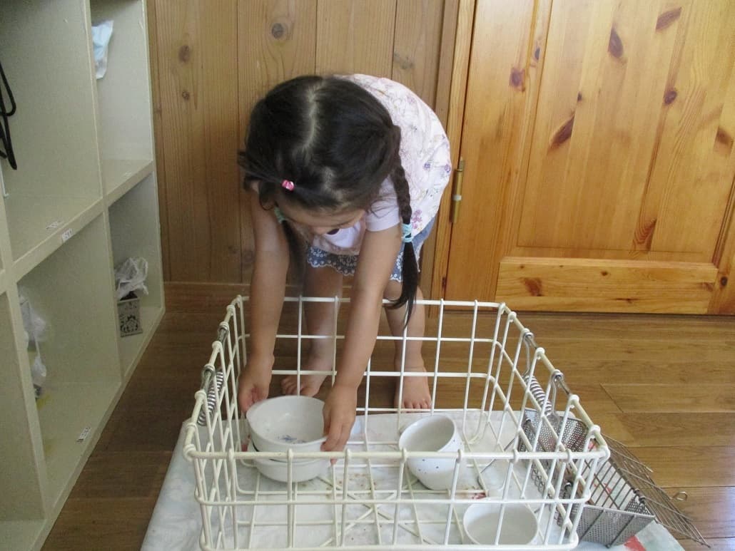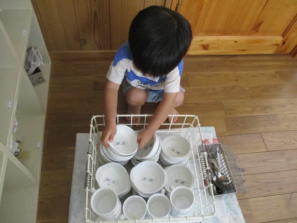 ところが、2歳児の食事を見てみると、食事の後自分の食器は自分でカゴに片付けるのですが、重ねて置く時もガチャンと音が出ないようにそっと積み重ねていました。置く場所も少し傾くようなら別の場所を自分で探して、そっと置いています。2歳児がちゃんと壊れないように自分で考えて置いている姿を見て、感動すらします。下手をすると大人の方が音を立ててガチャンと置いているかもしれません。