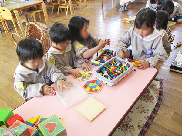 幼児においても引き続き発達が進み、多様な遊びの環境が必要となります。構造遊び、机上遊び、見立て遊び、ごっこ遊び、粗大運動を活発に行える園庭等。それらが生活空間の中により多くあるということを大事にしています。