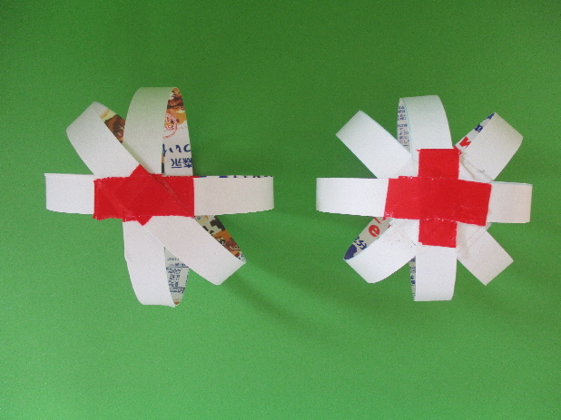 ② ①を2本1組にして、布ガムテープで貼り合わせて輪を4つ作る。